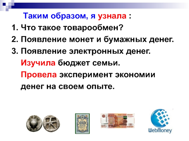 В разных местах деньгами служили разные предметы. И они назывались товаро-деньгами. Например, в древней Монголии это прессованный чай, на Королинских островах деньгами служили огромные камни. Сдвинуть такую «деньгу» с места могли только несколько человек. Первыми мировыми деньгами были раковины каури с Мальдивских островов. В Древней Руси использовали меха ценных животных, например шкурки лисицы, соболи и т.д.