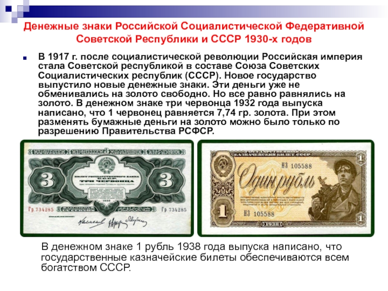 В 1917 г. после социалистической революции Российская империя стала Советской республикой в составе Союза Советских Социалистических республик (СССР). Новое государство выпустило новые денежные знаки. Эти деньги уже не обменивались на золото свободно. Но все равно равнялись на золото. В денежном знаке три червонца 1932 года выпуска написано, что 1 червонец равняется 7,74 гр. золота. При этом разменять бумажные деньги на золото можно было только по разрешению Правительства РСФСР.