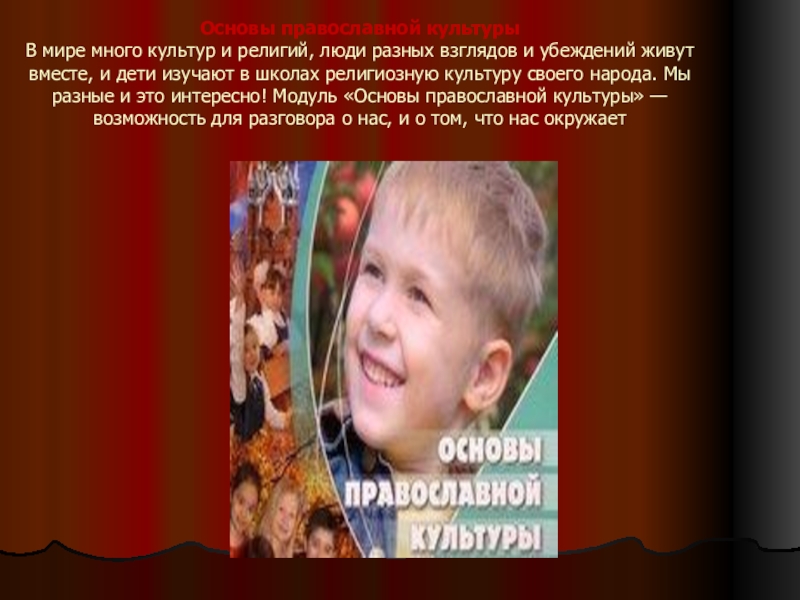 взглядов и убеждений живут вместе, и дети изучают в школах религиозную культуру своего народа. Мы разные и это интересно! Модуль «Основы православной культуры» — возможность для разговора о нас, и о том, что нас окружает
