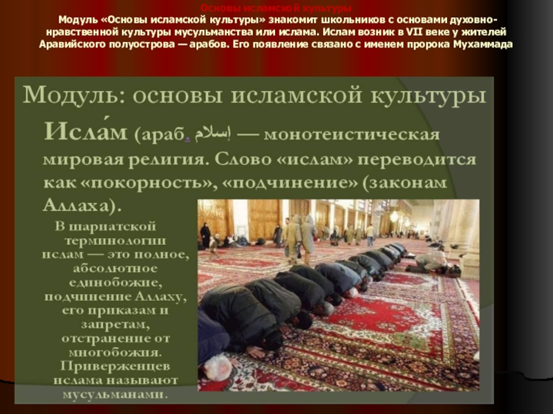 духовно-нравственной культуры мусульманства или ислама. Ислам возник в VII веке у жителей Аравийского полуострова — арабов. Его появление связано с именем пророка Мухаммада