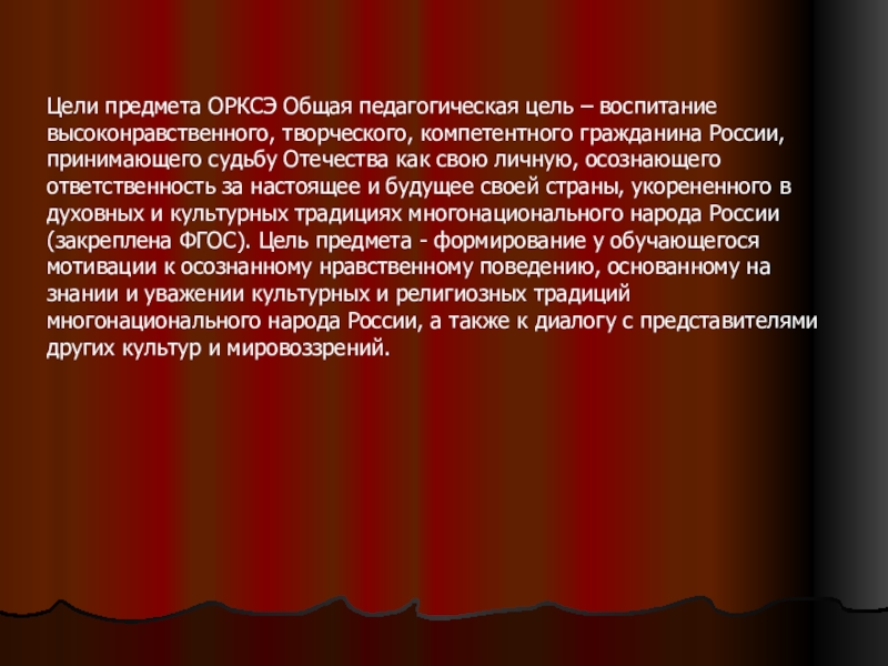 гражданина России, принимающего судьбу Отечества как свою личную, осознающего ответственность за настоящее и будущее своей страны, укорененного в духовных и культурных традициях многонационального народа России (закреплена ФГОС). Цель предмета - формирование у обучающегося мотивации к осознанному нравственному поведению, основанному на знании и уважении культурных и религиозных традиций многонационального народа России, а также к диалогу с представителями других культур и мировоззрений.
