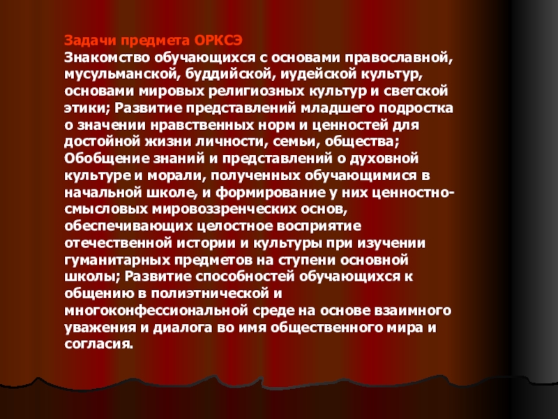 культур, основами мировых религиозных культур и светской этики; Развитие представлений младшего подростка о значении нравственных норм и ценностей для достойной жизни личности, семьи, общества; Обобщение знаний и представлений о духовной культуре и морали, полученных обучающимися в начальной школе, и формирование у них ценностно-смысловых мировоззренческих основ, обеспечивающих целостное восприятие отечественной истории и культуры при изучении гуманитарных предметов на ступени основной школы; Развитие способностей обучающихся к общению в полиэтнической и многоконфессиональной среде на основе взаимного уважения и диалога во имя общественного мира и согласия.