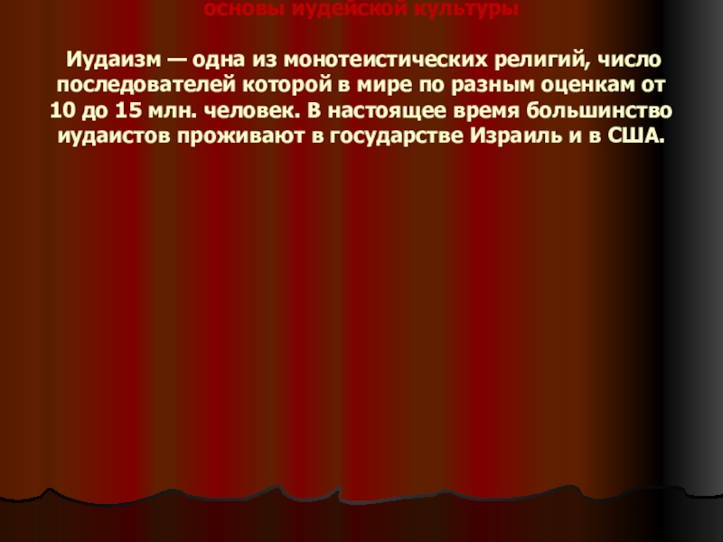 которой в мире по разным оценкам от 10 до 15 млн. человек. В настоящее время большинство иудаистов проживают в государстве Израиль и в США.
