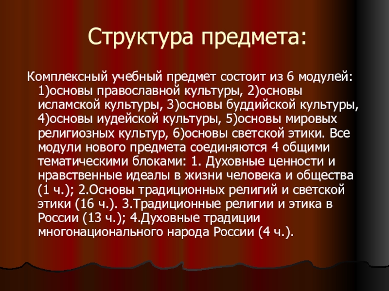культуры, 2)основы исламской культуры, 3)основы буддийской культуры, 4)основы иудейской культуры, 5)основы мировых религиозных культур, 6)основы светской этики. Все модули нового предмета соединяются 4 общими тематическими блоками: 1. Духовные ценности и нравственные идеалы в жизни человека и общества (1 ч.); 2.Основы традиционных религий и светской этики (16 ч.). 3.Традиционные религии и этика в России (13 ч.); 4.Духовные традиции многонационального народа России (4 ч.).