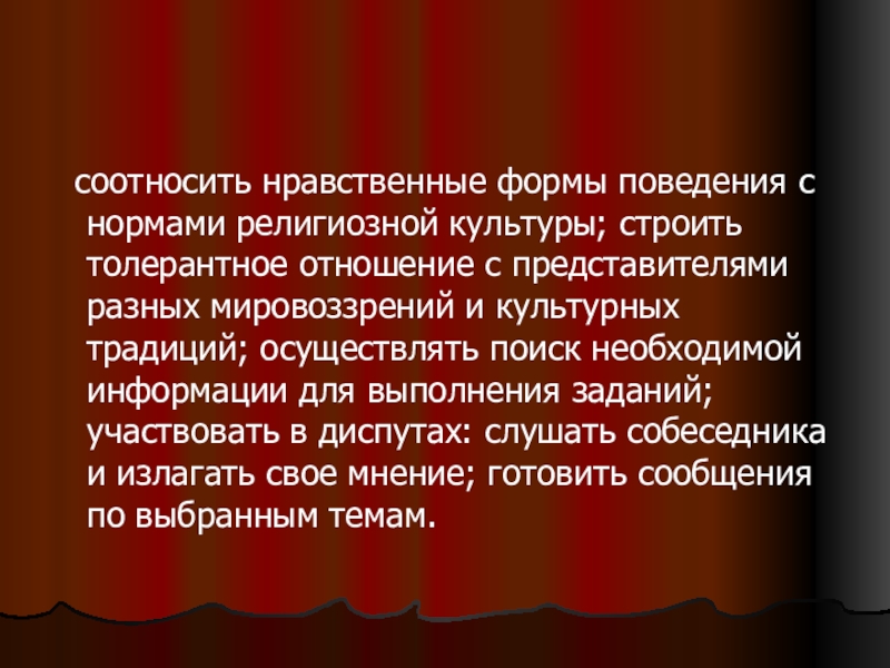 отношение с представителями разных мировоззрений и культурных традиций; осуществлять поиск необходимой информации для выполнения заданий; участвовать в диспутах: слушать собеседника и излагать свое мнение; готовить сообщения по выбранным темам.