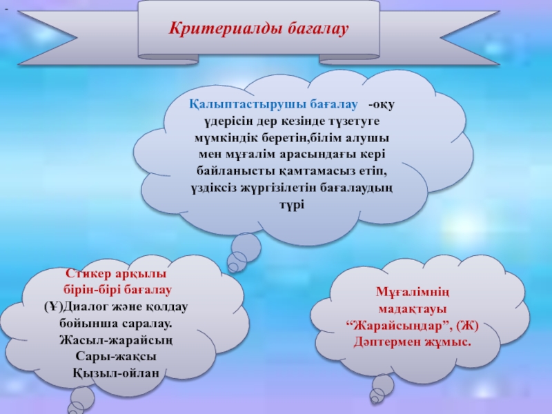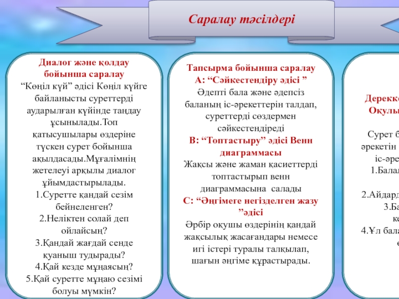 “жақсылық”және “жамандық” сөздерін тақтаға іліп қоямын.Әр топтан бір оқушыдан шығып,оқушыларға қарап тұрады.Интербелсенді тақтадан суреттер көрсетемін,топтағы оқушылар суреттерді сипаттайды.Шыққан оқушылар жақсылық жайлы айтса ақ текшені,жамандық жайлы айтса қара текшені көтереді,көп көтерген оқушының тобы жеңіске жетеді