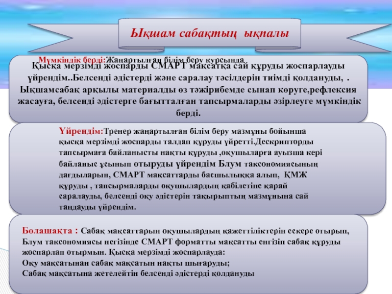 Сабақ соңында оқушылар бүгінгі сабақтағы көңіл-күйлерін және сабақтан алған әсерлерін жазып шығады.