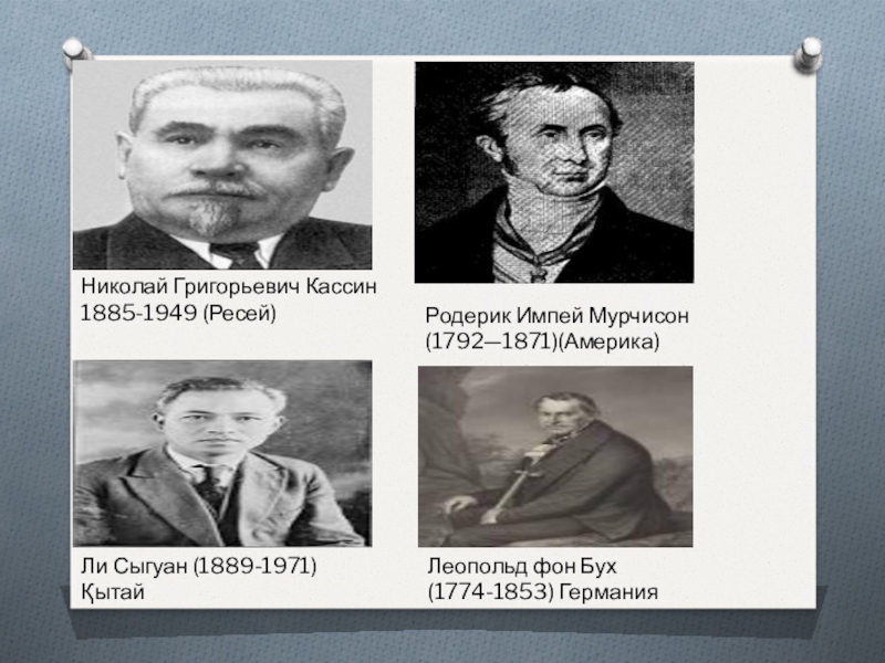 Николай Григорьевич Кассин1885-1949 (Ресей)Родерик Импей Мурчисон(1792—1871)(Америка)Ли Сыгуан (1889-1971) ҚытайЛеопольд фон Бух (1774-1853) Германия