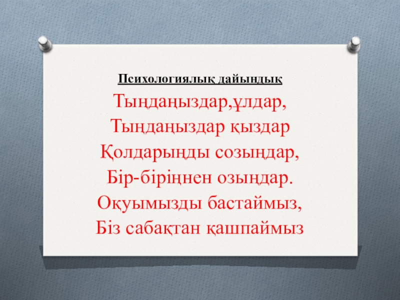 Психологиялық дайындықТыңдаңыздар,ұлдар,Тыңдаңыздар қыздарҚолдарыңды созыңдар,Бір-біріңнен озыңдар.Оқуымызды бастаймыз,Біз сабақтан қашпаймыз