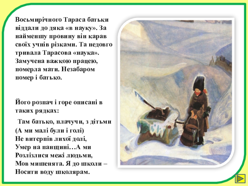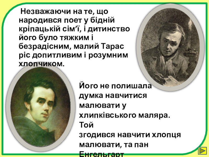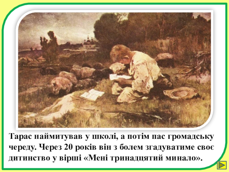 Незважаючи на те, що народився поет у бідній кріпацькій сім’ї, і дитинство його було тяжким і безрадісним, малий Тарас ріс допитливим і розумним хлопчиком.