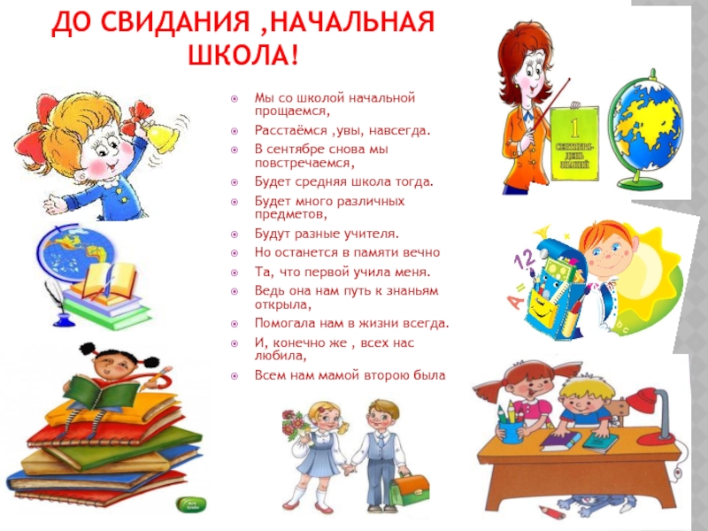 До свидания ,начальная школа!Мы со школой начальной прощаемся,Расстаёмся ,увы, навсегда.В сентябре снова мы повстречаемся,Будет средняя школа тогда.Будет