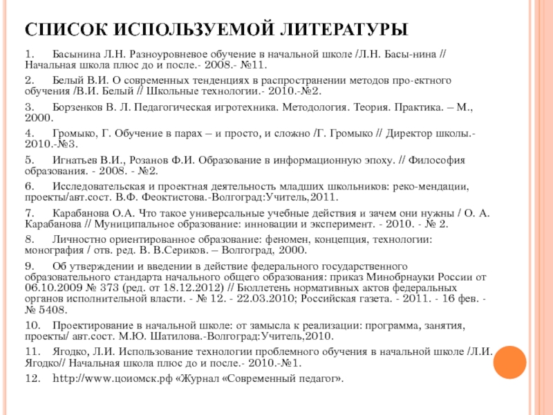 1. Басынина Л.Н. Разноуровневое обучение в начальной школе /Л.Н. Басы-нина