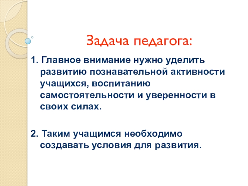 1. Главное внимание нужно уделить развитию познавательной активности учащихся, воспитанию