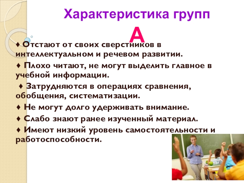♦ Имеют низкий уровень самостоятельности и работоспособности.