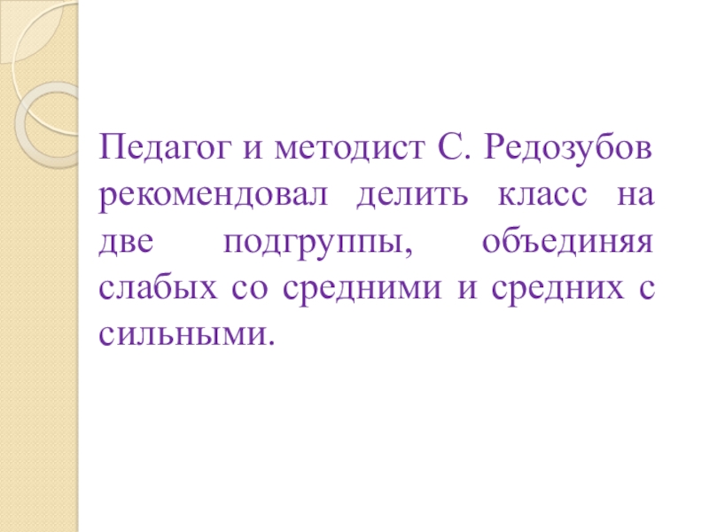 Слайд 18Педагог и методист С. Редозубов рекомендовал делить класс на две подгруппы,