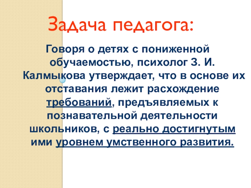 Слайд 27Говоря о детях с пониженной обучаемостью, психолог З. И. Калмыкова утверждает,