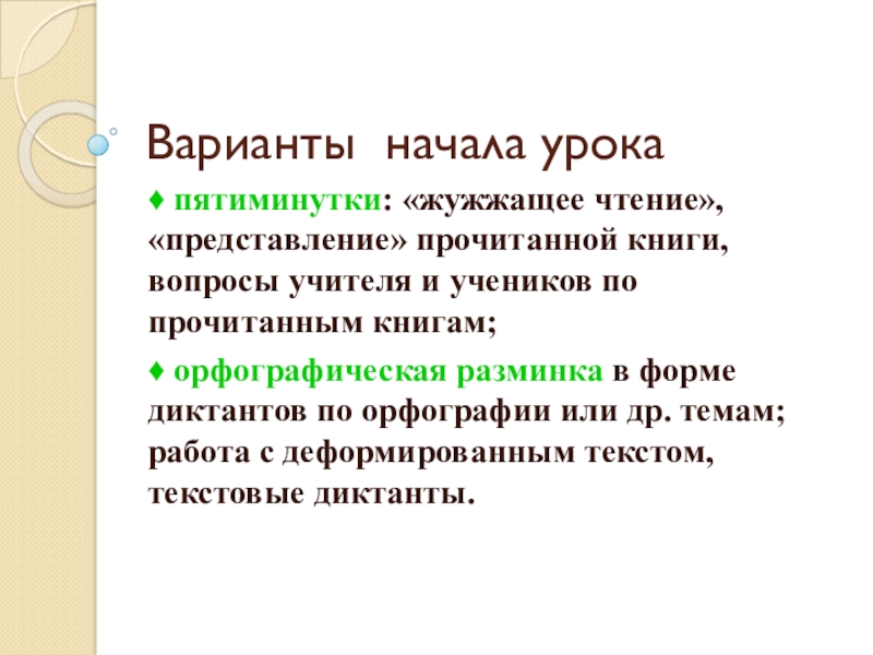 ♦ орфографическая разминка в форме диктантов по орфографии или др. темам; работа с деформированным текстом, текстовые диктанты.