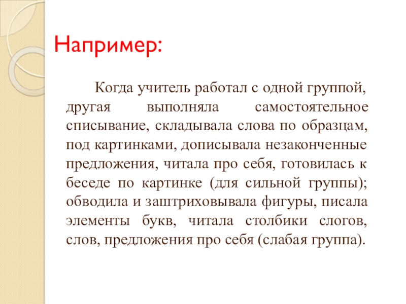 выполняла самостоятельное списывание, складывала слова по образцам, под картинками, дописывала незаконченные предложения, читала про себя, готовилась к беседе по картинке (для сильной группы); обводила и заштриховывала фигуры, писала элементы букв, читала столбики слогов, слов, предложения про себя (слабая группа).