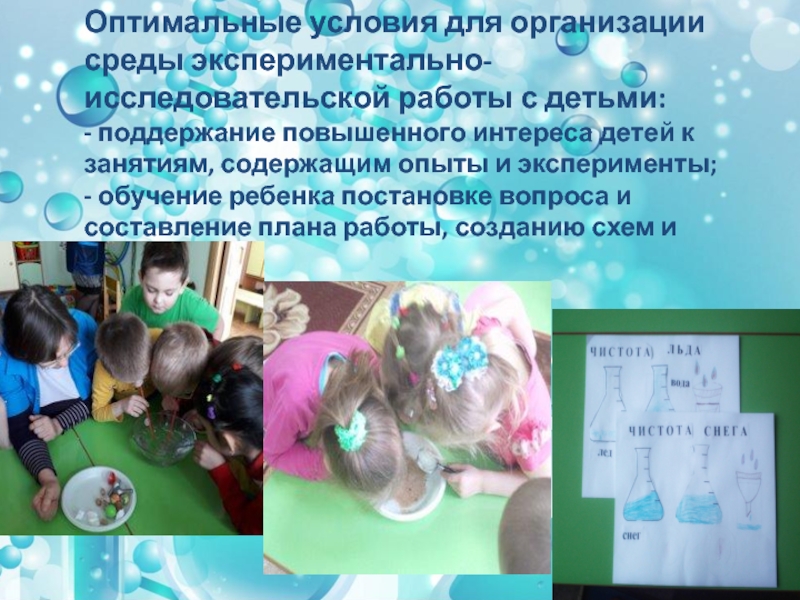 Слайд 8Оптимальные условия для организации среды экспериментально-исследовательской работы с детьми: