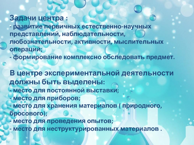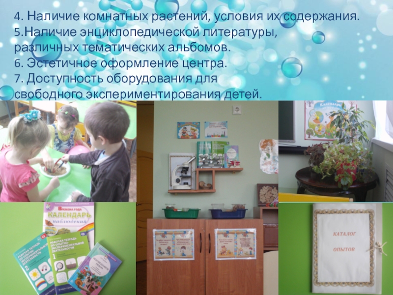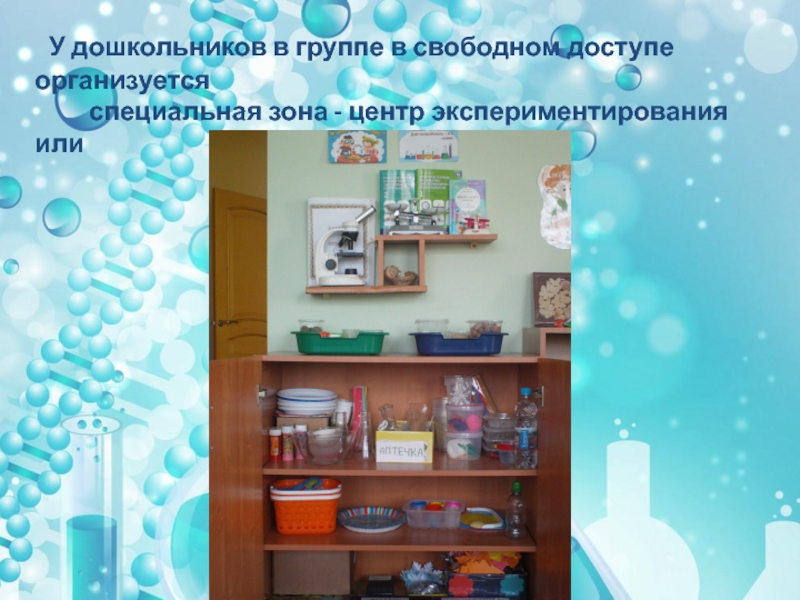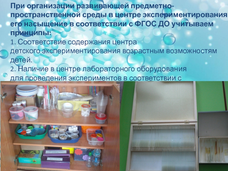 Слайд 6При организации развивающей предметно-пространственной среды в центре экспериментирования и его насыщение в соответствии