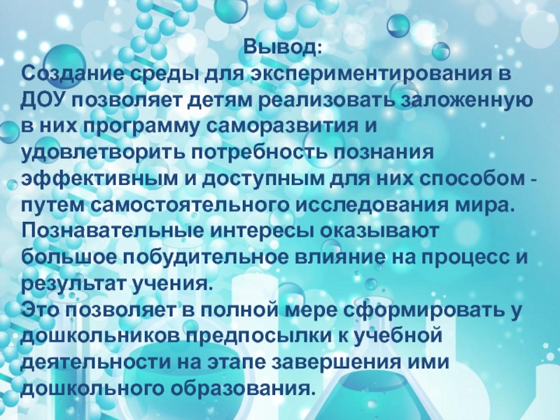 Создание среды для экспериментирования в ДОУ позволяет детям реализовать заложенную в них программу саморазвития и удовлетворить потребность познания эффективным и доступным для них способом - путем самостоятельного исследования мира. Познавательные интересы оказывают большое побудительное влияние на процесс и результат учения.