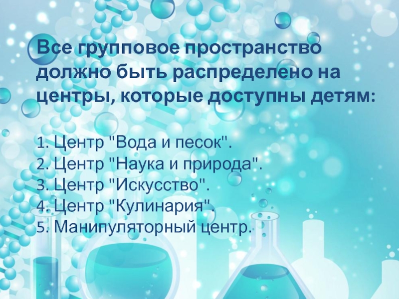 Слайд 4Все групповое пространство должно быть распределено на центры, которые доступны детям: