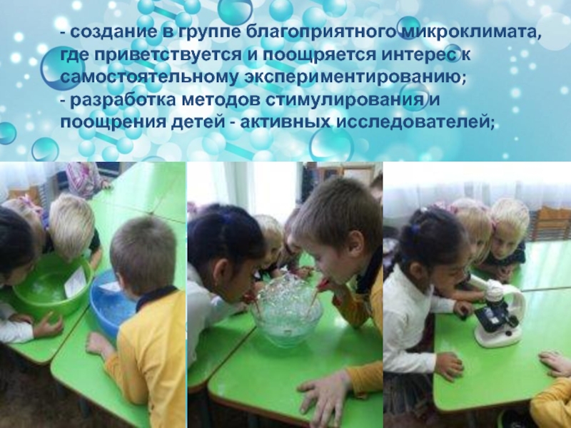 - разработка методов стимулирования и поощрения детей - активных исследователей;