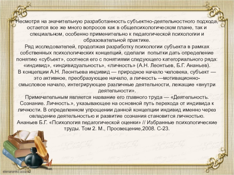 Слайд 14Несмотря на значительную разработанность субъектно-деятельностного подхода, остается все же много вопросов как в общепсихологическом плане,