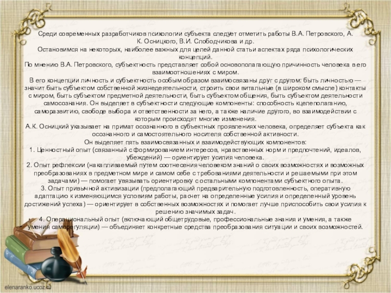 Слайд 19Среди современных разработчиков психологии субъекта следует отметить работы В.А. Петровского, А.К. Осницкого,