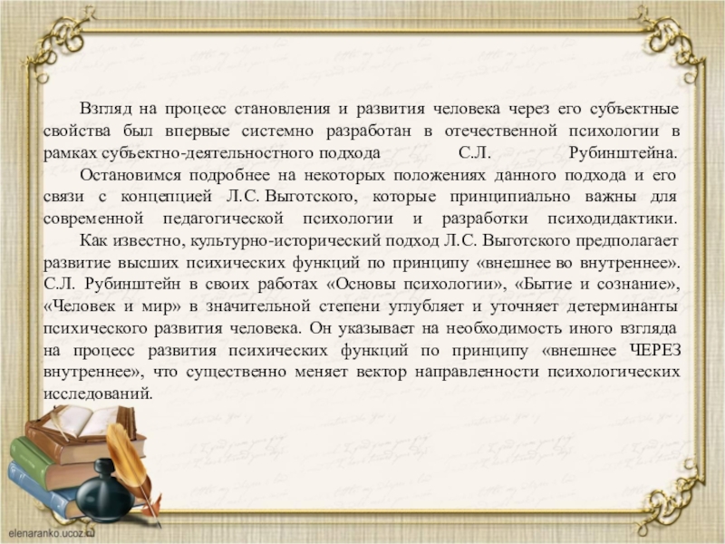 Как известно, культурно-исторический подход Л.С. Выготского предполагает развитие высших психических функций по принципу «внешнее во внутреннее». С.Л. Рубинштейн в своих работах «Основы психологии», «Бытие и сознание», «Человек и мир» в значительной степени углубляет и уточняет детерминанты психического развития человека. Он указывает на необходимость иного взгляда на процесс развития психических функций по принципу «внешнее ЧЕРЕЗ внутреннее», что существенно меняет вектор направленности психологических исследований.