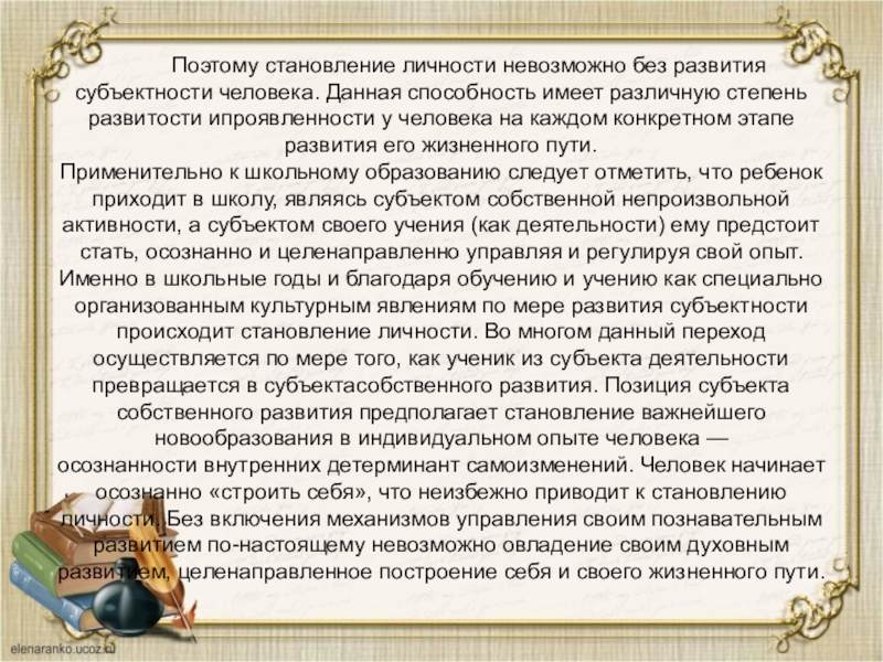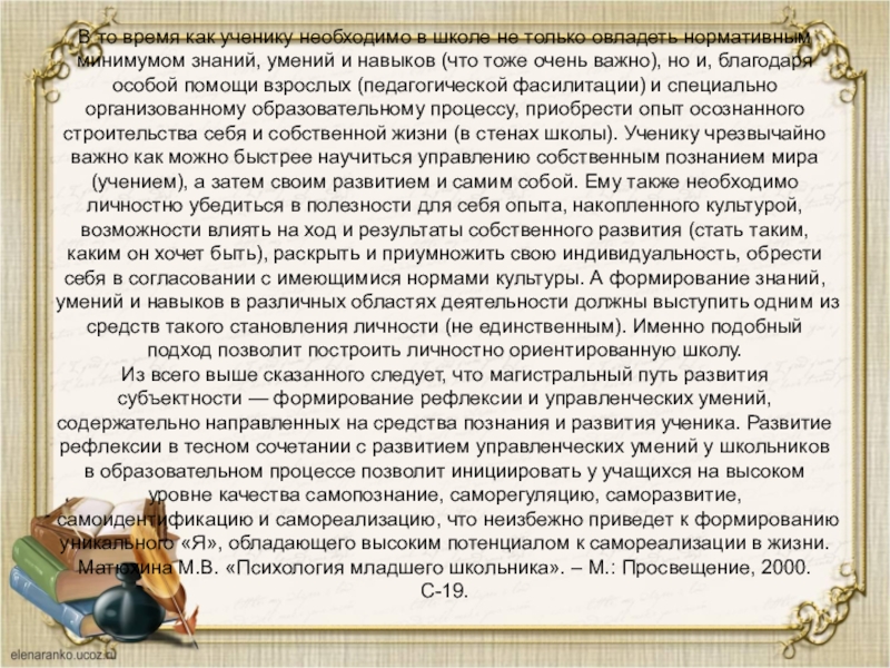 Применительно к школьному образованию следует отметить, что ребенок приходит в школу, являясь субъектом собственной непроизвольной активности, а субъектом своего учения (как деятельности) ему предстоит стать, осознанно и целенаправленно управляя и регулируя свой опыт. Именно в школьные годы и благодаря обучению и учению как специально организованным культурным явлениям по мере развития субъектности происходит становление личности. Во многом данный переход осуществляется по мере того, как ученик из субъекта деятельности превращается в субъектасобственного развития. Позиция субъекта собственного развития предполагает становление важнейшего новообразования в индивидуальном опыте человека — осознанности внутренних детерминант самоизменений. Человек начинает осознанно «строить себя», что неизбежно приводит к становлению личности. Без включения механизмов управления своим познавательным развитием по-настоящему невозможно овладение своим духовным развитием, целенаправленное построение себя и своего жизненного пути.