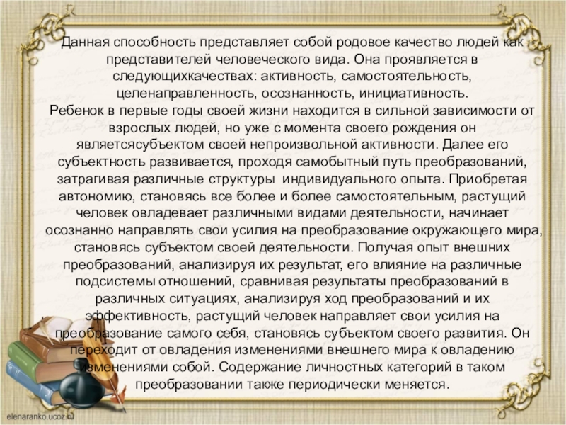 раскрывающая родовое качество человека (как Homo sapiens) — самодетерминацию, которая определяет способность человека к саморегуляции и саморазвитию, овладению своими особыми природными качествами и их развитием в деятельности, авторское отношение к своей жизни, способность выбирать свой жизненный путь и управлять им, постепенно обретая позицию «хозяина своей жизни».