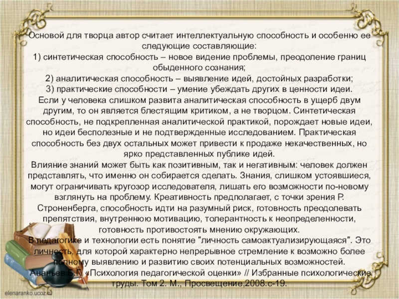 Слайд 32Основой для творца автор считает интеллектуальную способность и особенно ее следующие