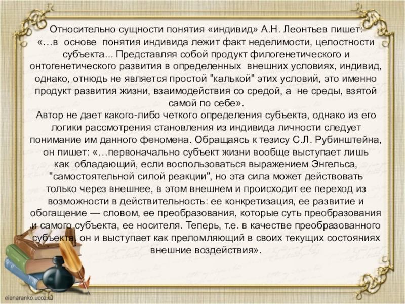 неделимости, целостности субъекта... Представляя собой продукт филогенетического и онтогенетического развития в определенных внешних условиях, индивид, однако, отнюдь не является простой "калькой" этих условий, это именно продукт развития жизни, взаимодействия со средой, а не среды, взятой самой по себе».