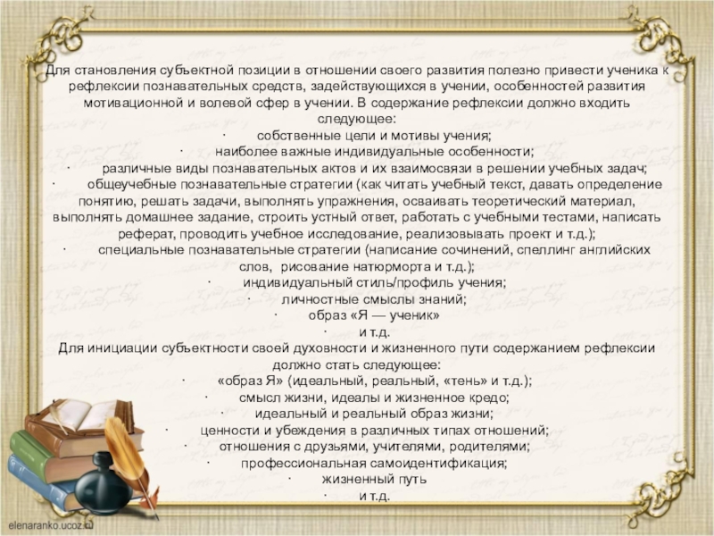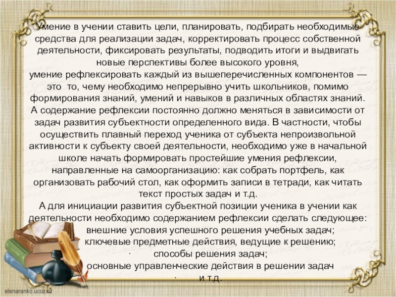 задач, корректировать процесс собственной деятельности, фиксировать результаты, подводить итоги и выдвигать новые перспективы более высокого уровня, умение рефлексировать каждый из вышеперечисленных компонентов — это то, чему необходимо непрерывно учить школьников, помимо формирования знаний, умений и навыков в различных областях знаний. А содержание рефлексии постоянно должно меняться в зависимости от задач развития субъектности определенного вида. В частности, чтобы осуществить плавный переход ученика от субъекта непроизвольной активности к субъекту своей деятельности, необходимо уже в начальной школе начать формировать простейшие умения рефлексии, направленные на самоорганизацию: как собрать портфель, как организовать рабочий стол, как оформить записи в тетради, как читать текст простых задач и т.д.