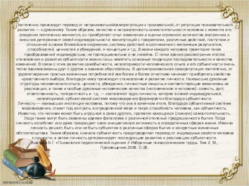 субъекта жизни… Личность не есть целостность, обусловленная генотипически: личностью не родятся, личностью становятся. Потому-то мы и не говорим о личности новорожденного или о личности младенца... Личность есть относительно поздний продукт общественно-исторического и онтогенетического развития человека».