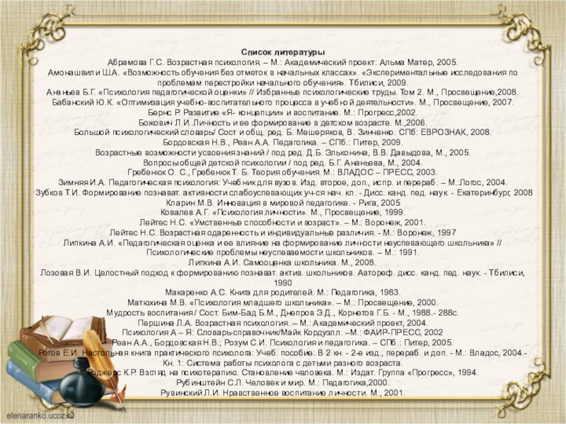 Липкина А.И. «Педагогическая оценка и ее влияние на формирование личности неуспевающего школьника» // Психологические проблемы неуспеваемости школьников. – М.: 1991.