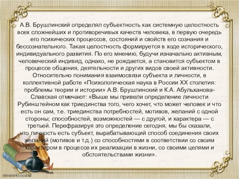 Слайд 13А.В. Брушлинский определял субъектность как системную целостность всех сложнейших и противоречивых качеств человека, в