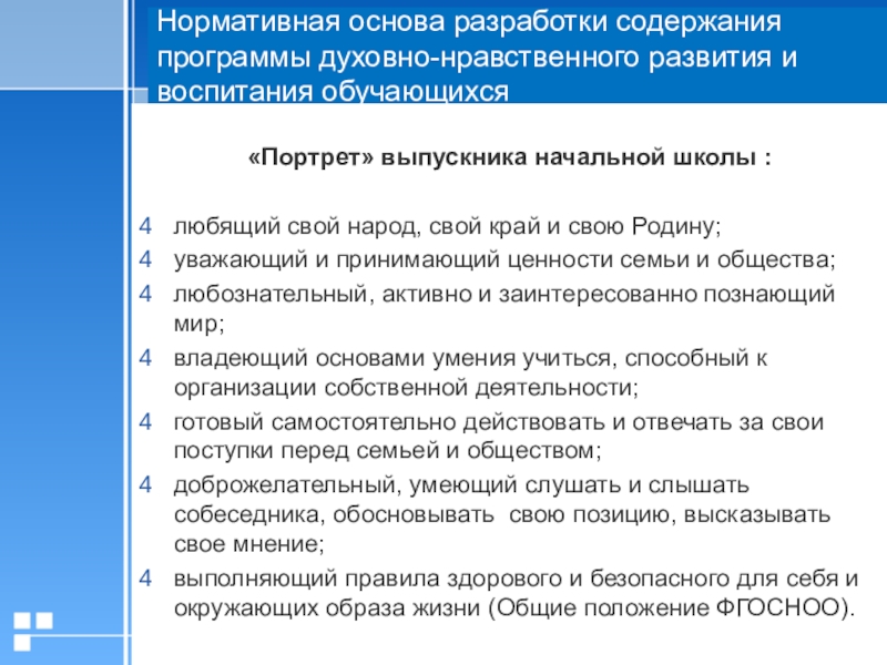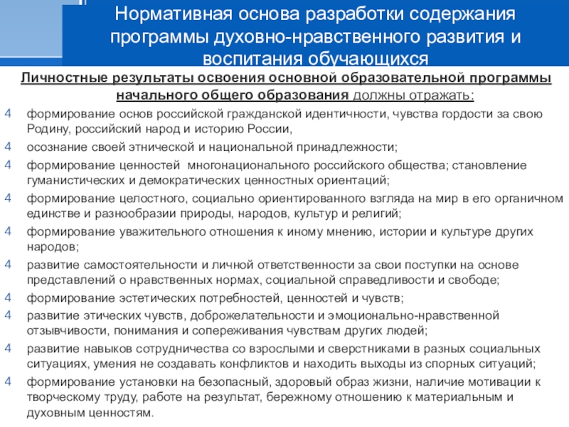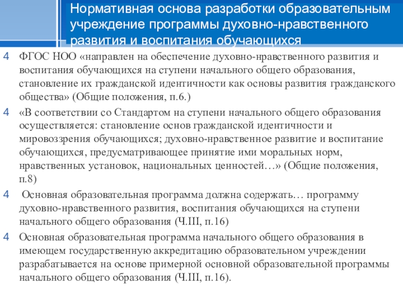 Слайд 13Нормативная основа разработки содержания программы духовно-нравственного развития и воспитания обучающихся