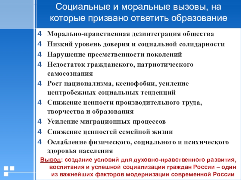 Слайд 3Социальные и моральные вызовы, на которые призвано ответить образование