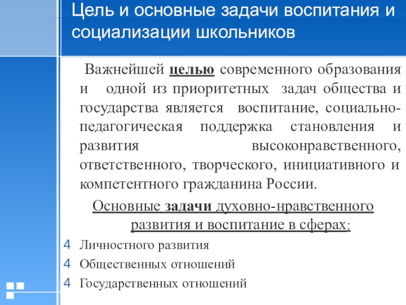 Слайд 7Цель и основные задачи воспитания и социализации школьников
