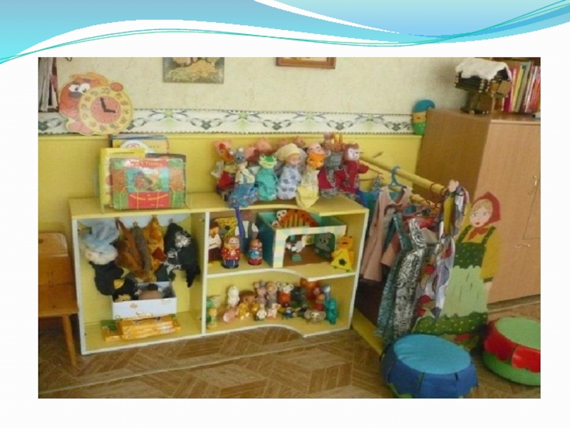 В группе имеется разные виды кукольного театра: театр картинок, пальчиковый, перчаточный, театр петрушек, театр марионеток, теневой театр фигур и масок, тростевые куклы, куклы с живой рукой.