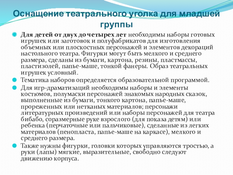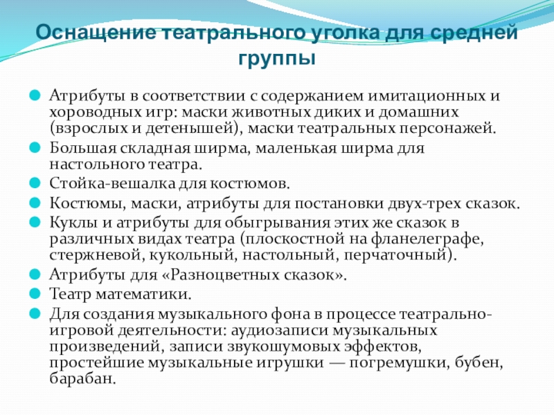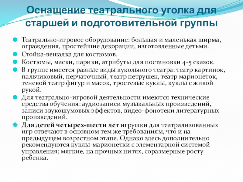 Слайд 8Оснащение театрального уголка для старшей и подготовительной группы