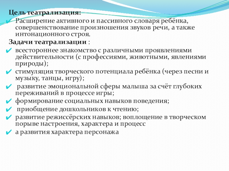 стимуляция творческого потенциала ребёнка (через песни и музыку, танцы, игру);