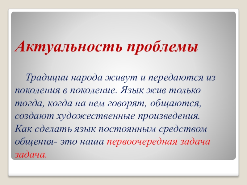 Актуальность проблемы    Традиции народа живут и передаются из поколения в поколение. Язык жив только