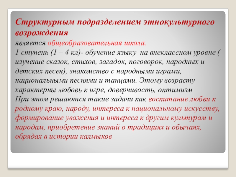 обучение языку на внеклассном уровне ( изучение сказок, стихов, загадок, поговорок, народных и детских песен), знакомство с народными играми, национальными песнями и танцами. Этому возрасту характерны любовь к игре, доверчивость, оптимизм При этом решаются такие задачи как воспитание любви к родному краю, народу, интереса к национальному искусству, формирование уважения и интереса к другим культурам и народам, приобретение знаний о традициях и обычаях, обрядах в истории калмыков