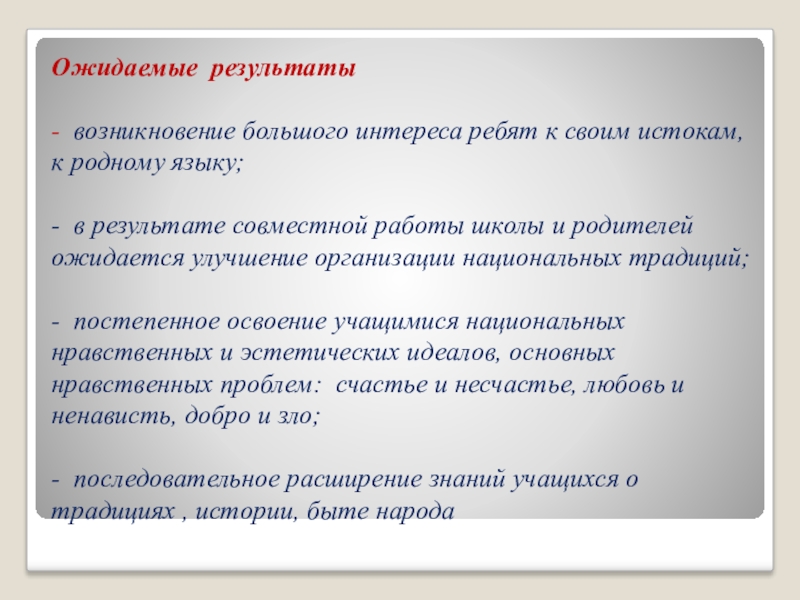 языку; - в результате совместной работы школы и родителей ожидается улучшение организации национальных традиций; - постепенное освоение учащимися национальных нравственных и эстетических идеалов, основных нравственных проблем: счастье и несчастье, любовь и ненависть, добро и зло; - последовательное расширение знаний учащихся о традициях , истории, быте народа