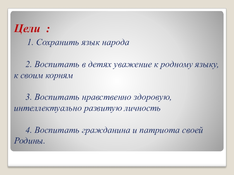Воспитать в детях уважение к родному языку, к своим корням 3. Воспитать нравственно здоровую, интеллектуально развитую личность 4. Воспитать гражданина и патриота своей Родины.