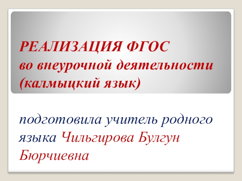 Слайд 1РЕАЛИЗАЦИЯ ФГОС во внеурочной деятельности (калмыцкий язык) подготовила учитель родного языка Чильгирова Булгун