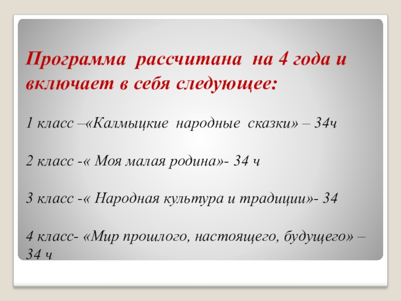 Программа рассчитана на 4 года и включает в себя следующее:  1 класс –«Калмыцкие народные сказки» –